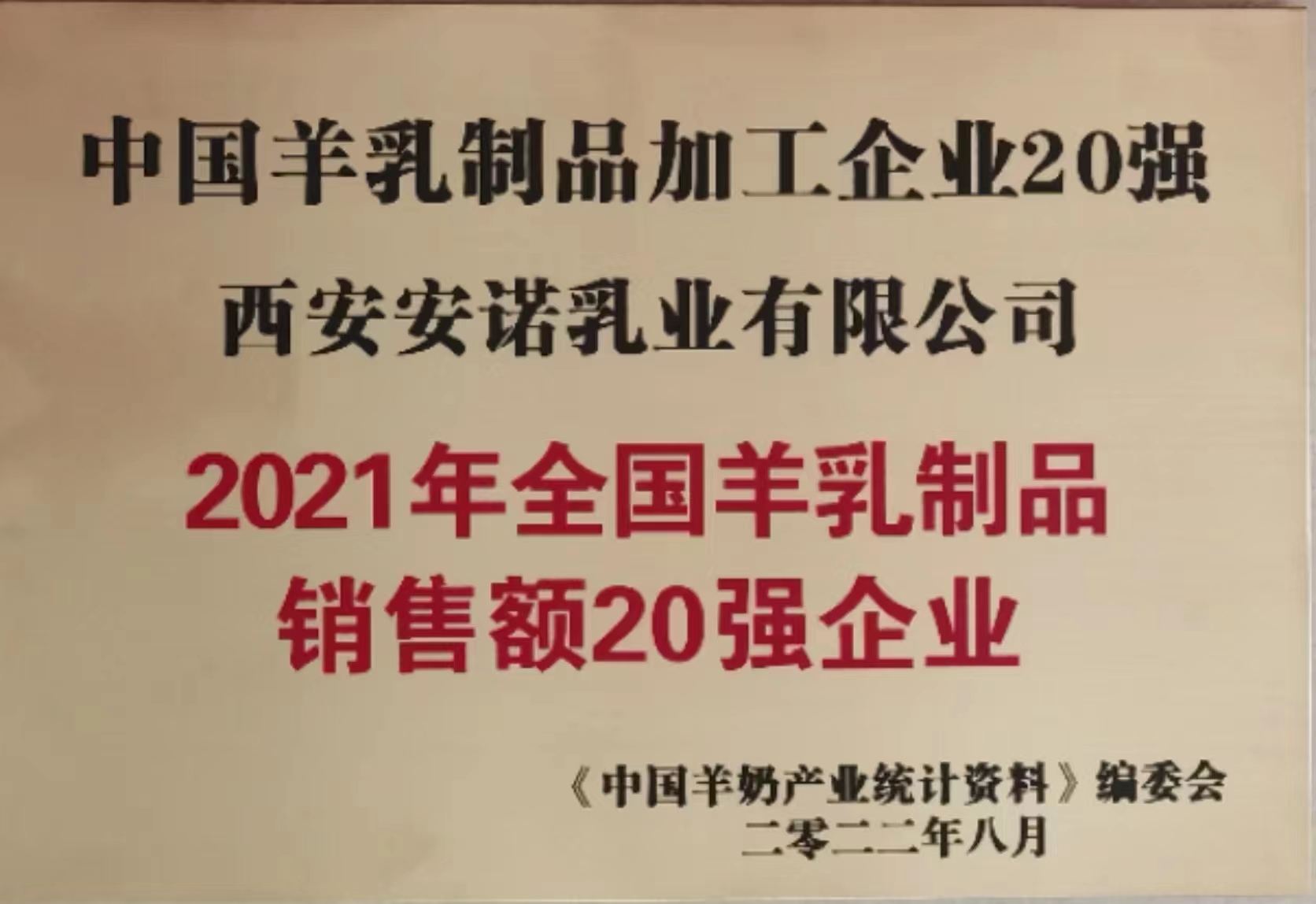 喜訊!安諾乳業(yè)榮獲“2021年全國羊乳制品加工企業(yè)20強”