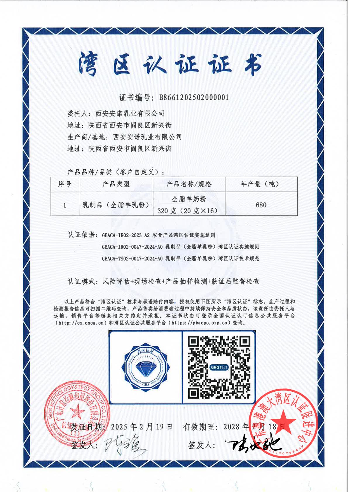 2025年2月19日,安諾乳業(yè)旗下全脂羊奶粉榮獲灣區(qū)認證證書,成為粵港澳大灣區(qū)大健康食品領域首批獲得該認證的羊乳制品企業(yè)。這不僅是安